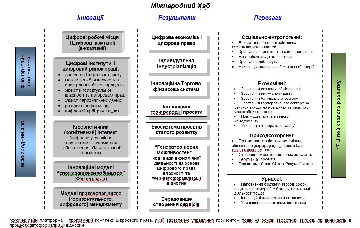 Міжнародний Хаб є новим інститутом, який в рамках концепції сталого розвитку ООН вводить необхідне розширення правових (цифрове право) і господарських механізмів (на базі цифрової інституціної платформи). На цій основі забезпечується цілісна модель управління Цілями сталого розвитку та Цифровою економікою (цифровою формою власності).